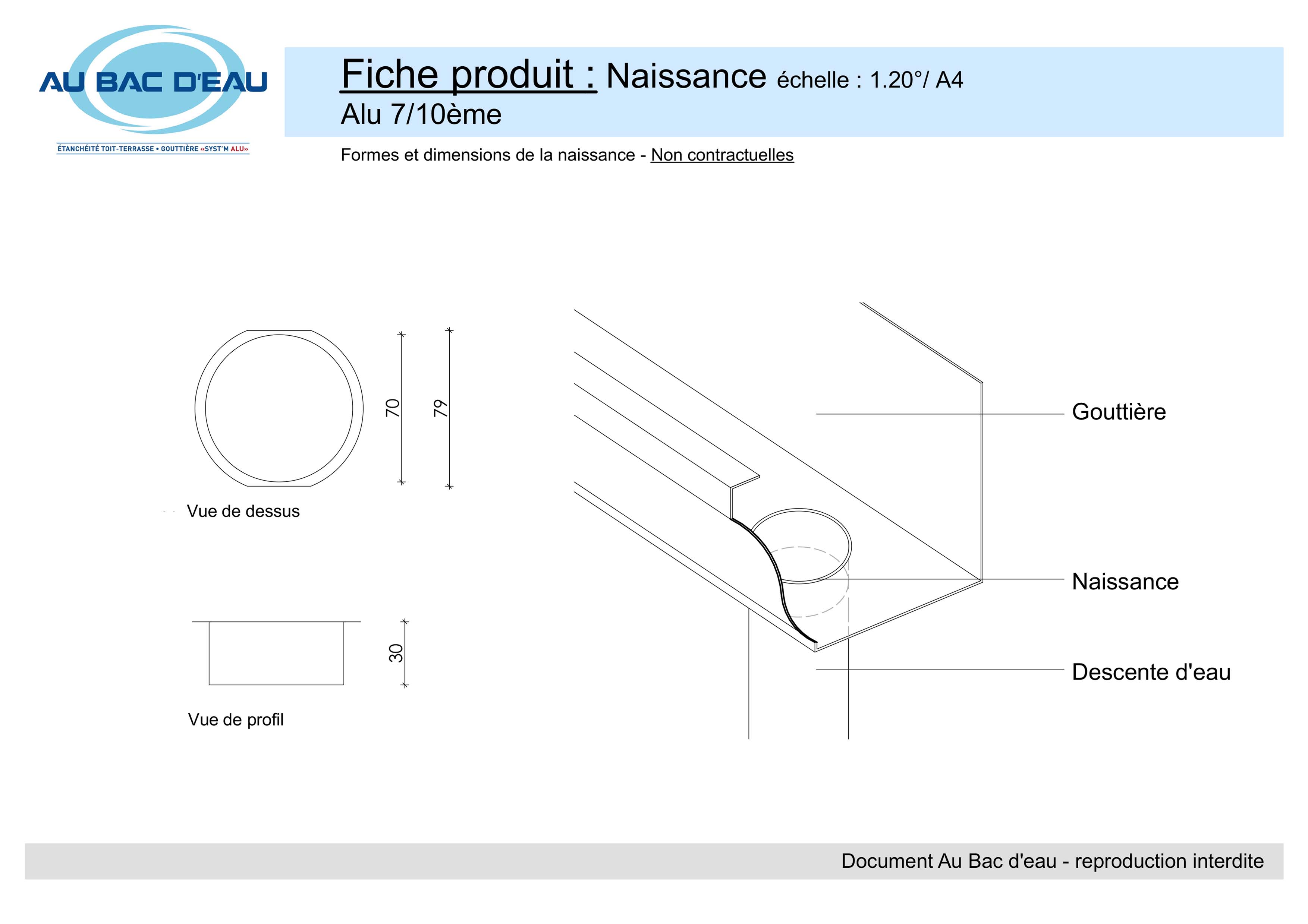 Les naissances d'eau en alu 7/10e s'adaptent sur les descentes d'eau 60 x 80 mm, 70 x 110 mm ou diamètre 80 mm et permettent de relier la gouttière à la descente d'eau pluviale. Article ni repris, ni échangé.